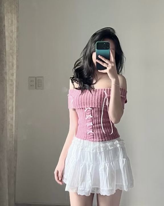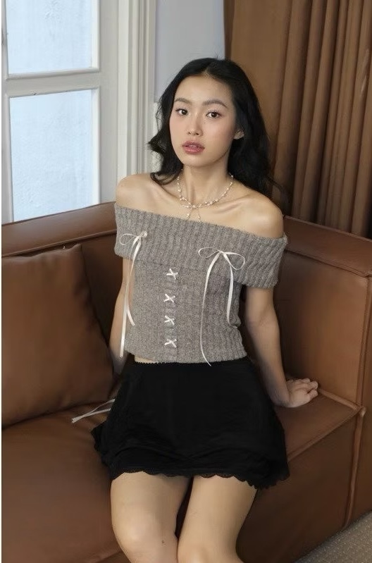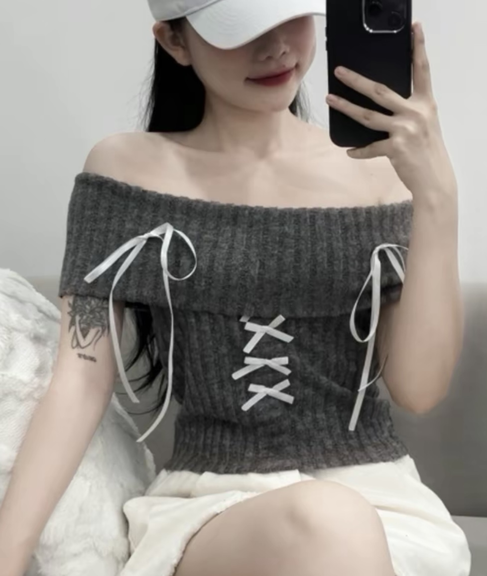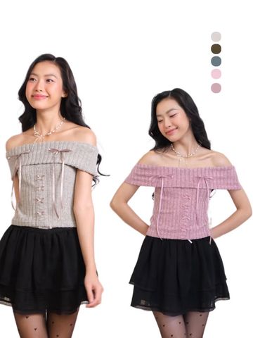 ÁO LEN CROPTOP BẸT VAI ĐÍNH NƠ