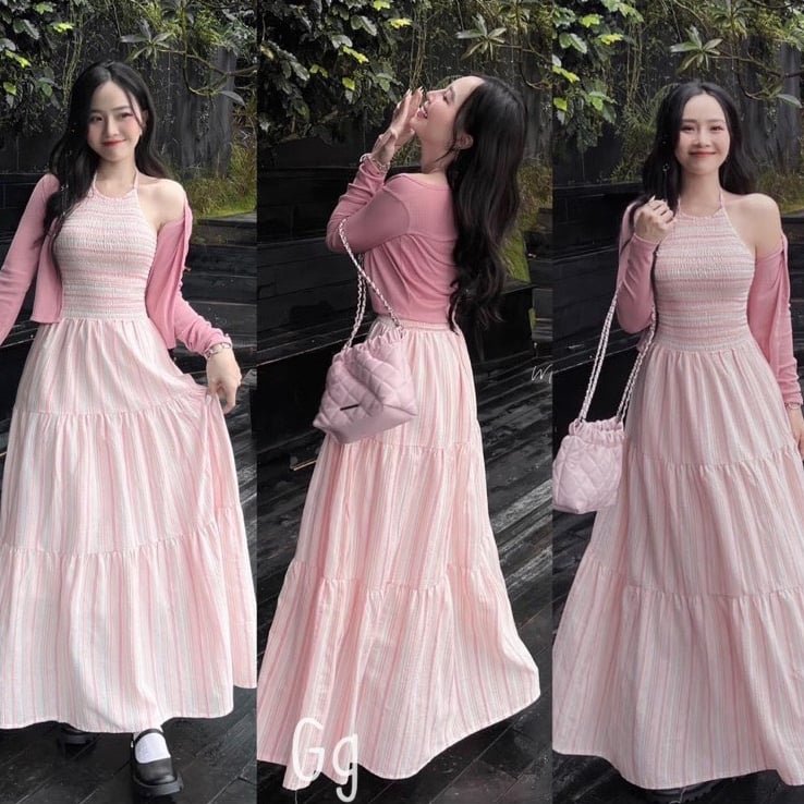 - Đầm váy maxi cổ yếm mocking dáng dài đến mắt cá chân, xòe nhẹ, mix cùng áo khoác ngoài giúp che chắn được cơ thể và giúp cho chiếc đầm trông duyên dáng mà vẫn kín đáo.