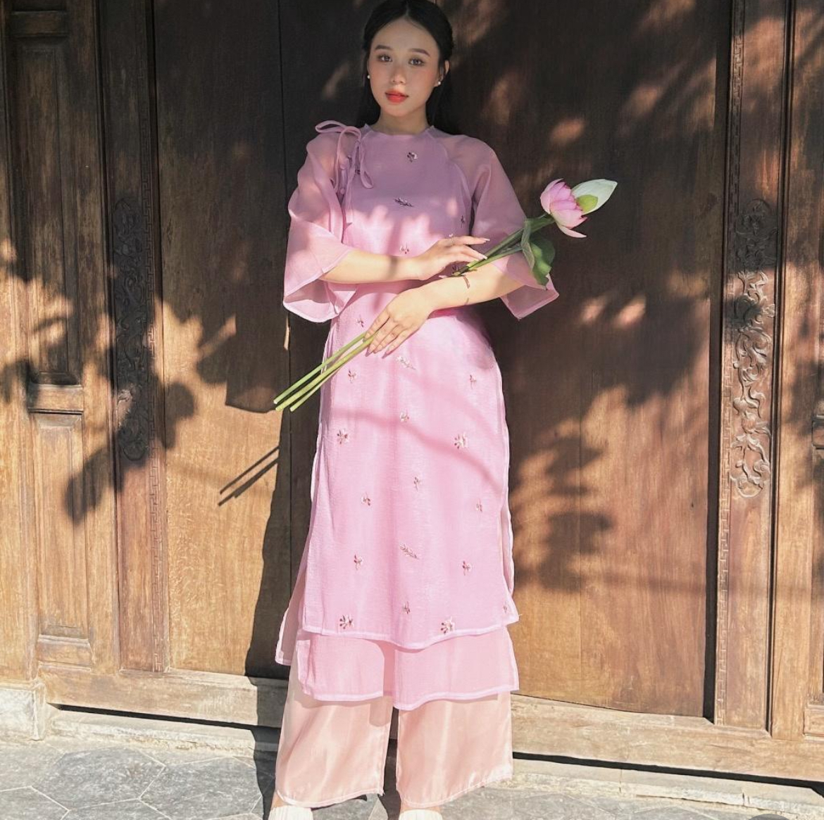 ÁO DÀI TƠ THÊU LÁ KÈM QUẦN LỤA DÀI