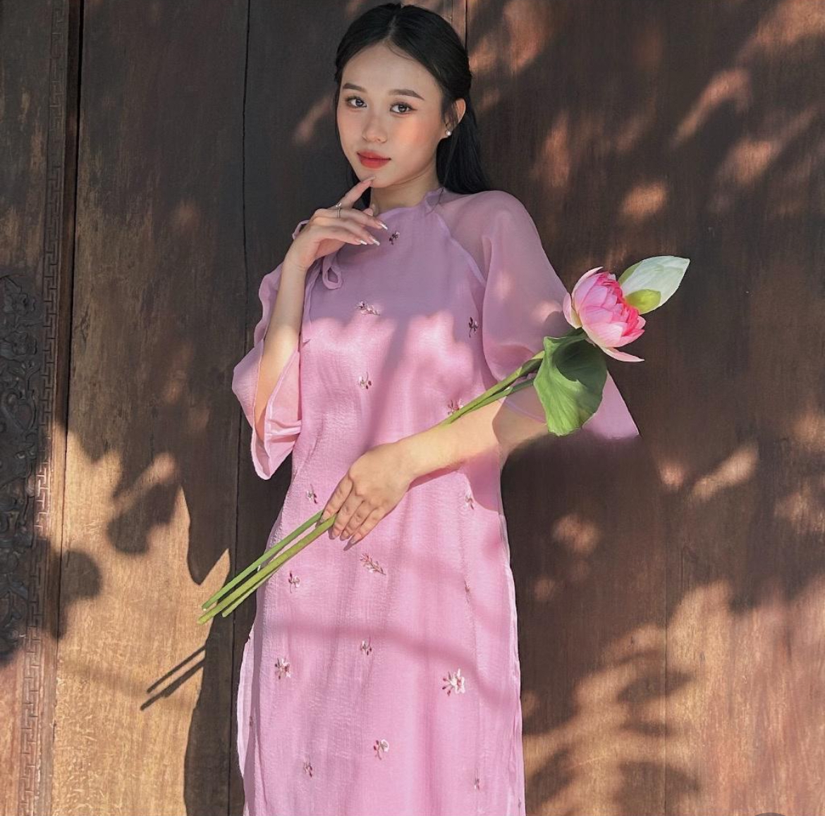 FREE SIZE ÁO DÀI VOAN TƠ TÍM 4 TÀ THEU HOA TAY LỬNG PHỐI NƠ