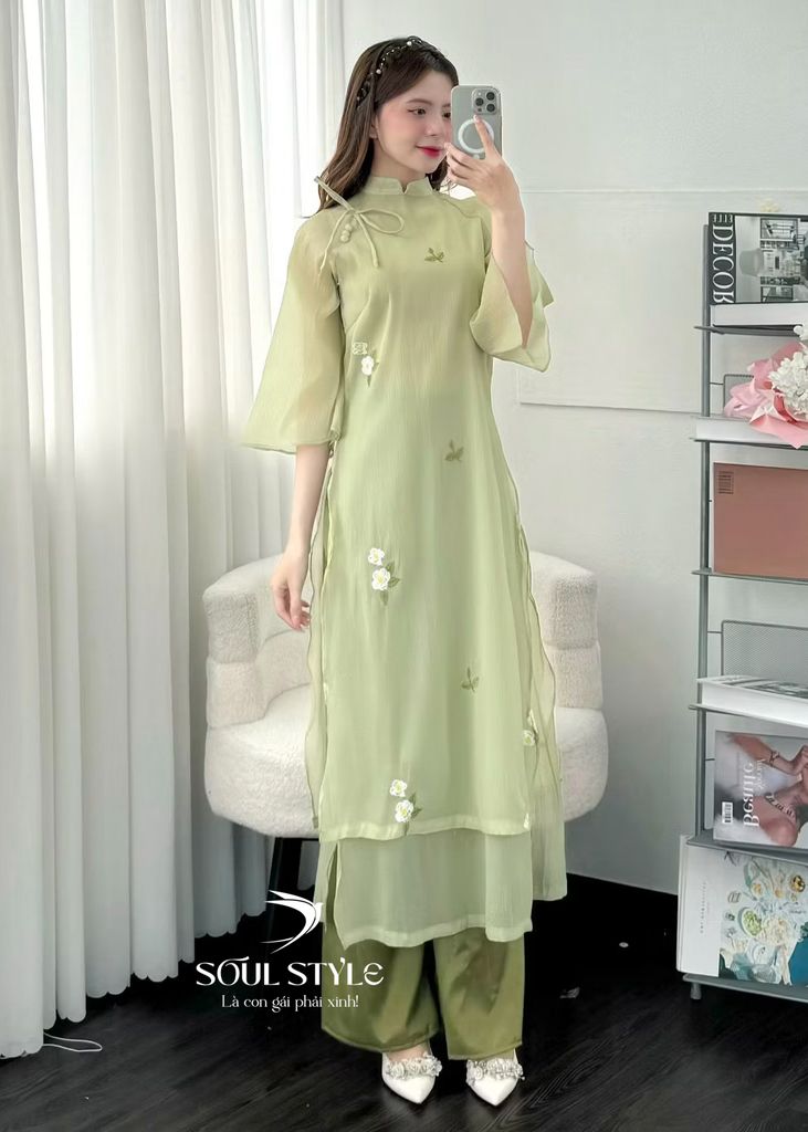 SET ÁO DÀI CÁCH TÂN VOAN TƠ XANH LÁ THÊU HOA NỔI