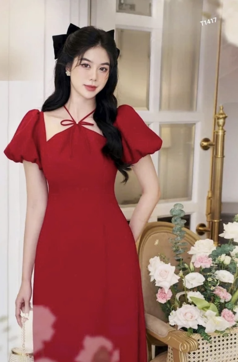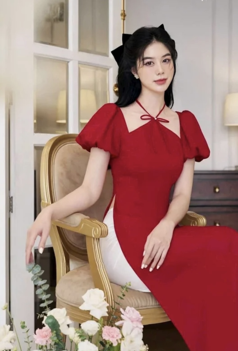 ÁO DÀI ĐỎ CÁCH TÂN KHOÉT CỔ NƠ KÈM CHÂN VÁY TƠ