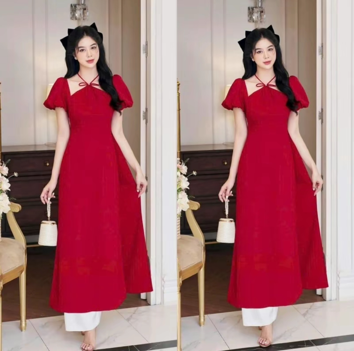 SET ÁO DÀI ĐỎ CỔ YẾM NƠ CỔ FREE SIZE KÈM QUẦN ỐNG SUÔNG