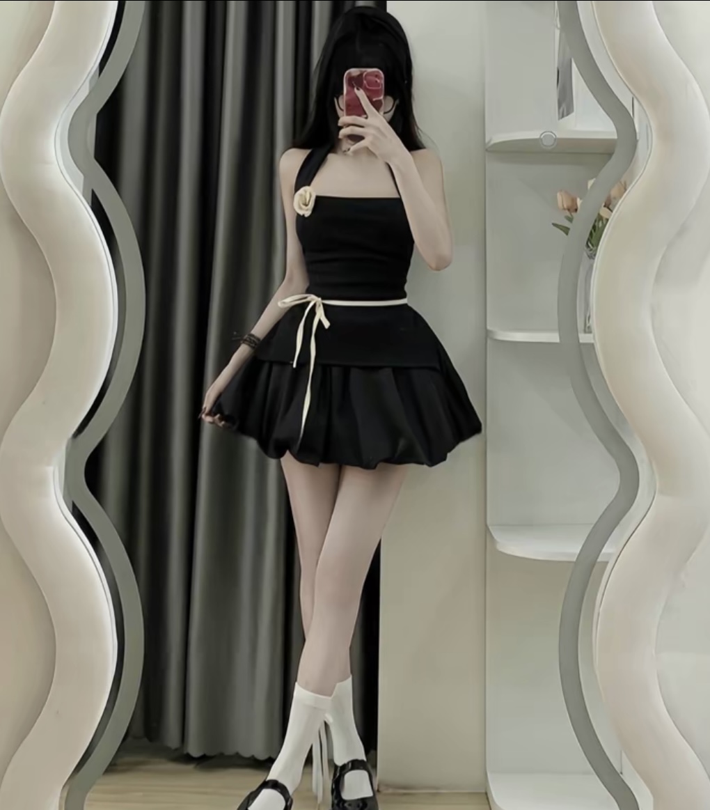 SET ÁO THUN CỔ YẾM XẺ TÀ KÈM TAG HOA QUẦN BÍ