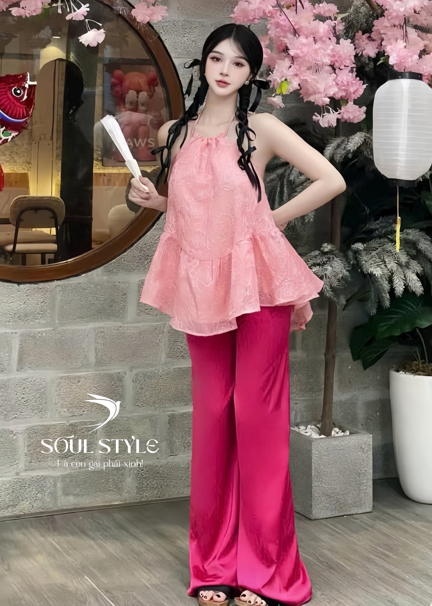 SET ÁO YẾM THÊU HOA HỒNG CHÌM PHỐI QUẦN DÀI